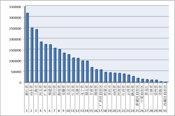 1-9月,我國31個?。▍^(qū)、市)拍賣成交額超過200億的有3個省(區(qū)、市),分別是浙江省、山東省、上海市(見圖3)。3個?。▍^(qū)、市)共計成交809.83億元,占上半年全行業(yè)拍賣成交額的28.37%。